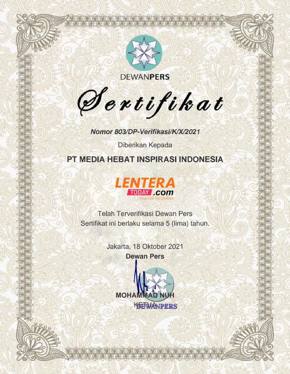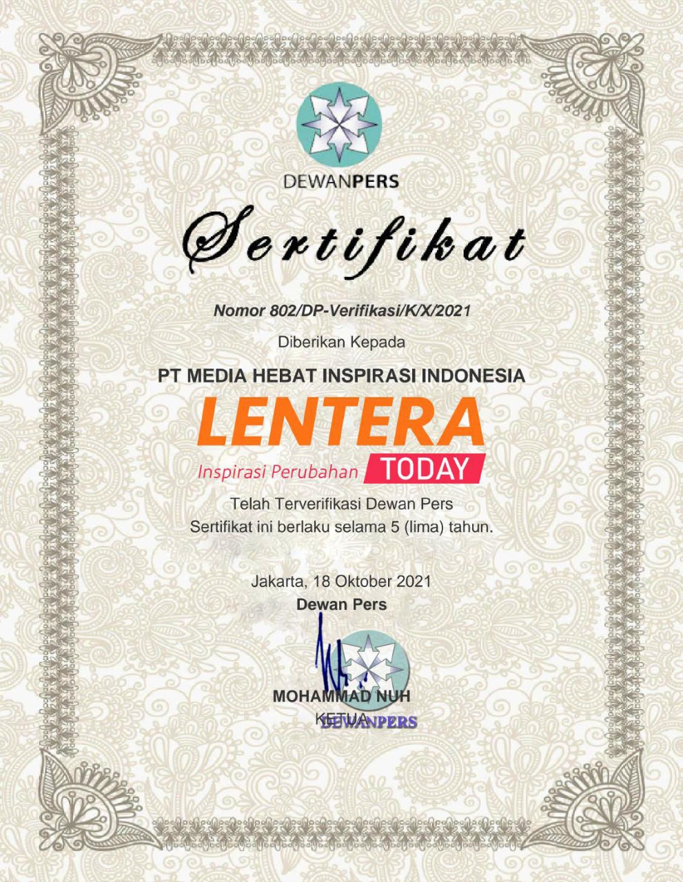 LENTERATODAY.com (cyber/portal berita) mengangkat informasi secara aktual dan terpercaya. Lenteratoday.com juga telah terverifikasi Dewan Pers. Keterangan lebih lanjut dapat dicek di www.dewanpers.or.id. Online di https://lentaratoday.com/